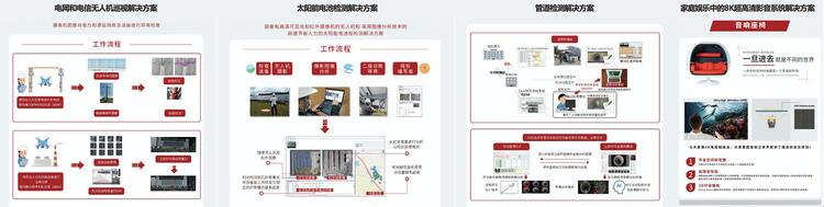 就此次大会上展示的多种解决方案为例:在电网输电线路巡检方面,夏普将超高清与AI技术相结合,通过装有超高清摄像头的无人机与AI分析技术,可及时发现线缆铁锈、设备老化、裂痕及其他异常情况;在检测大面积铺设面板方面,夏普推出了超高清电池面板解决方案,通过无人机+超高清摄像机+红外摄像机的组合,可以在5兆瓦以内的广泛电厂,一天内即可完成巡检并主动生成报告;在管道维护方面,夏普通过夏普AI技术,仅通过单眼8K镜头就可以准确定位管道中发生异常的位置,再通过无人车或者无人机,安全便捷的完成管道维护工作;在家庭应用方面,夏普提出了8K电视+22.2声道的全新家庭超高清影院解决方案与120英寸8K电视,打造真正的影院级沉浸式享受。