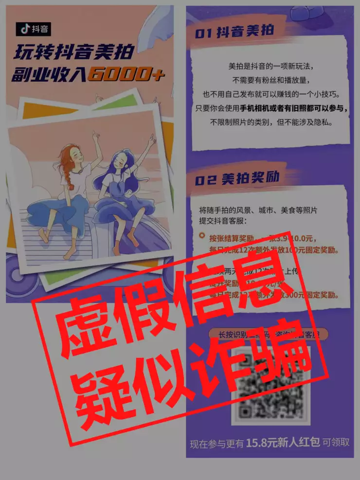 抖音日前公告称,平台接到用户反馈,称有公司以抖音名义,宣称所谓“美拍”项目为平台新玩法,用户可通过随手拍“风景”“美食”等内容并上传,获取金额不等的“奖励”。抖音表示,上述所谓项目与公司无任何关联,疑似为诈骗信息,公司已经报警,提醒用户提高警惕。(电商报)