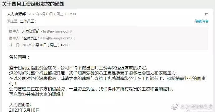 5月10日,网上流传一张爱驰汽车“关于四月工资延迟发放的通知”的图片。图片显示,鉴于目前面临的资金挑战,公司不得不做出四月工资再次延迟发放的决定。并表示公司管理层正在多方积极融资,一旦资金到位,将补齐所有缓发的工资和各项福利。