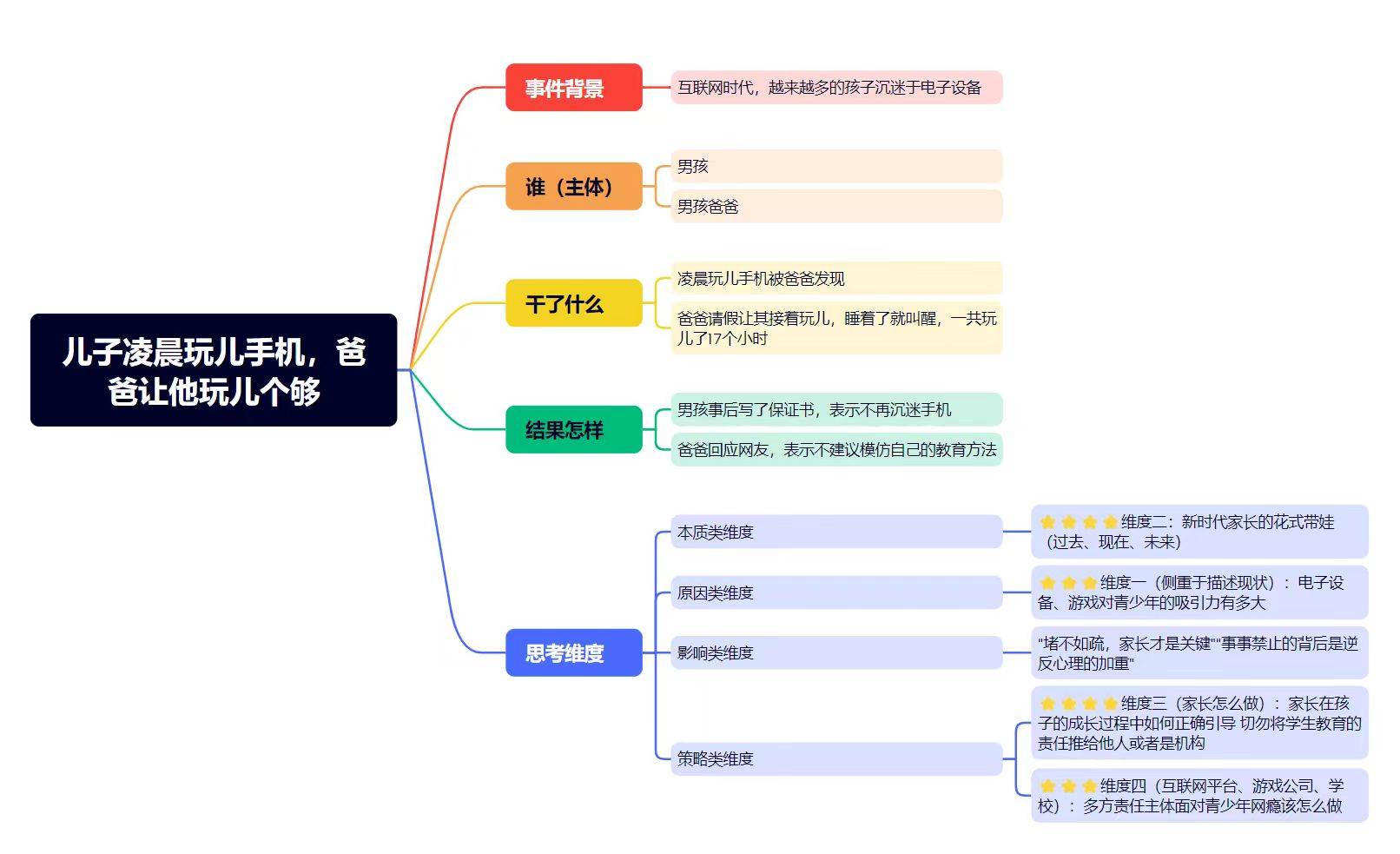 拿一个热点话题举例说明,“儿子凌晨玩儿手机,爸爸让他玩儿个够”。我们要从事件背景、谁、干了什么、结果怎样来分析话题, 最终总结出思考维度,维度又可以分为本质类维度、原因类维度、影响类维度、策略类维度。掌握分析话题的技巧,才能在模板泛滥的考场上脱颖而出,拿到理想的分数。
