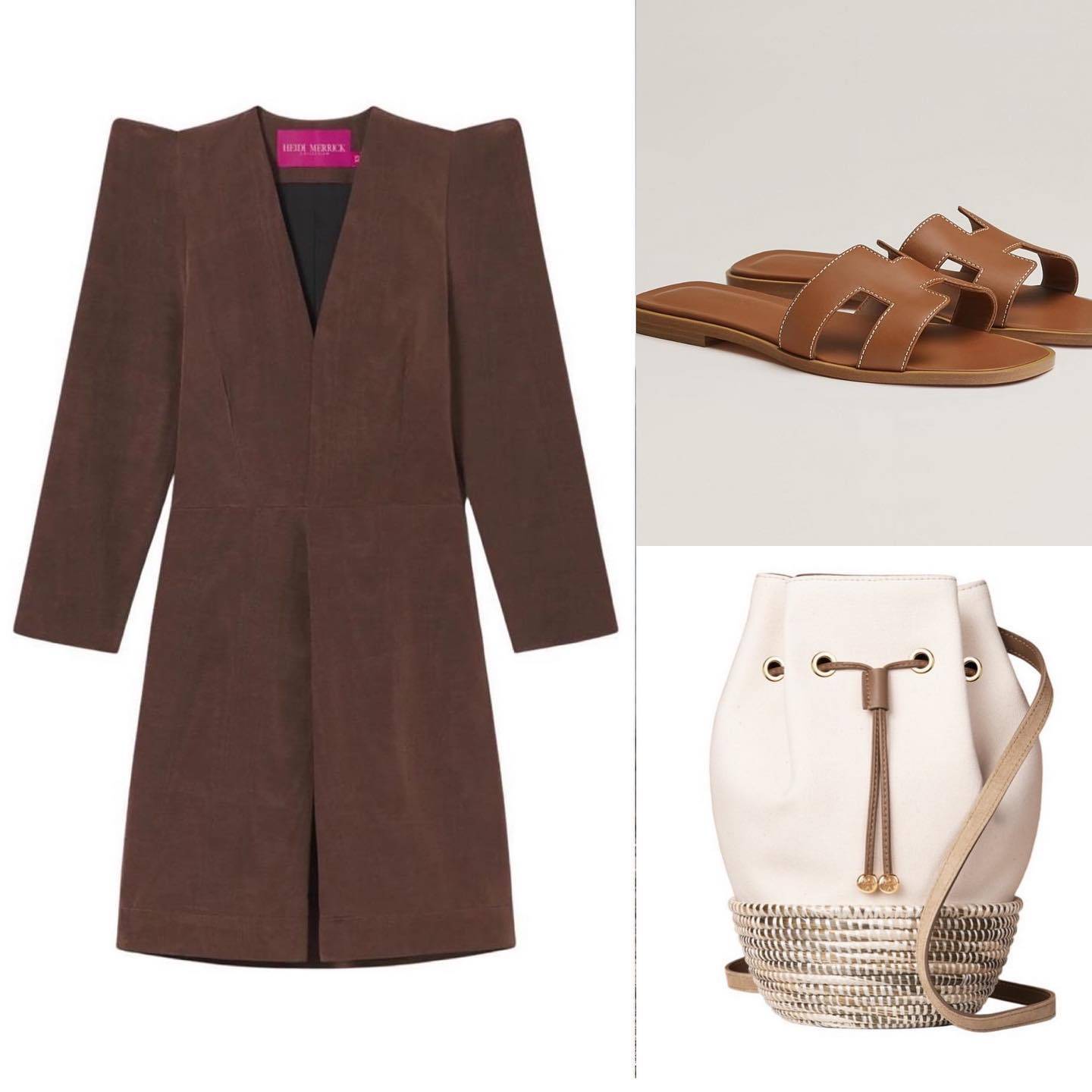 这件棕色的长款西装来自于Heidi Merrick,当迷你裙来穿还是很性感的,这件西装裙虽然不贵,但是脚上的这双爱马仕凉拖可不便宜。