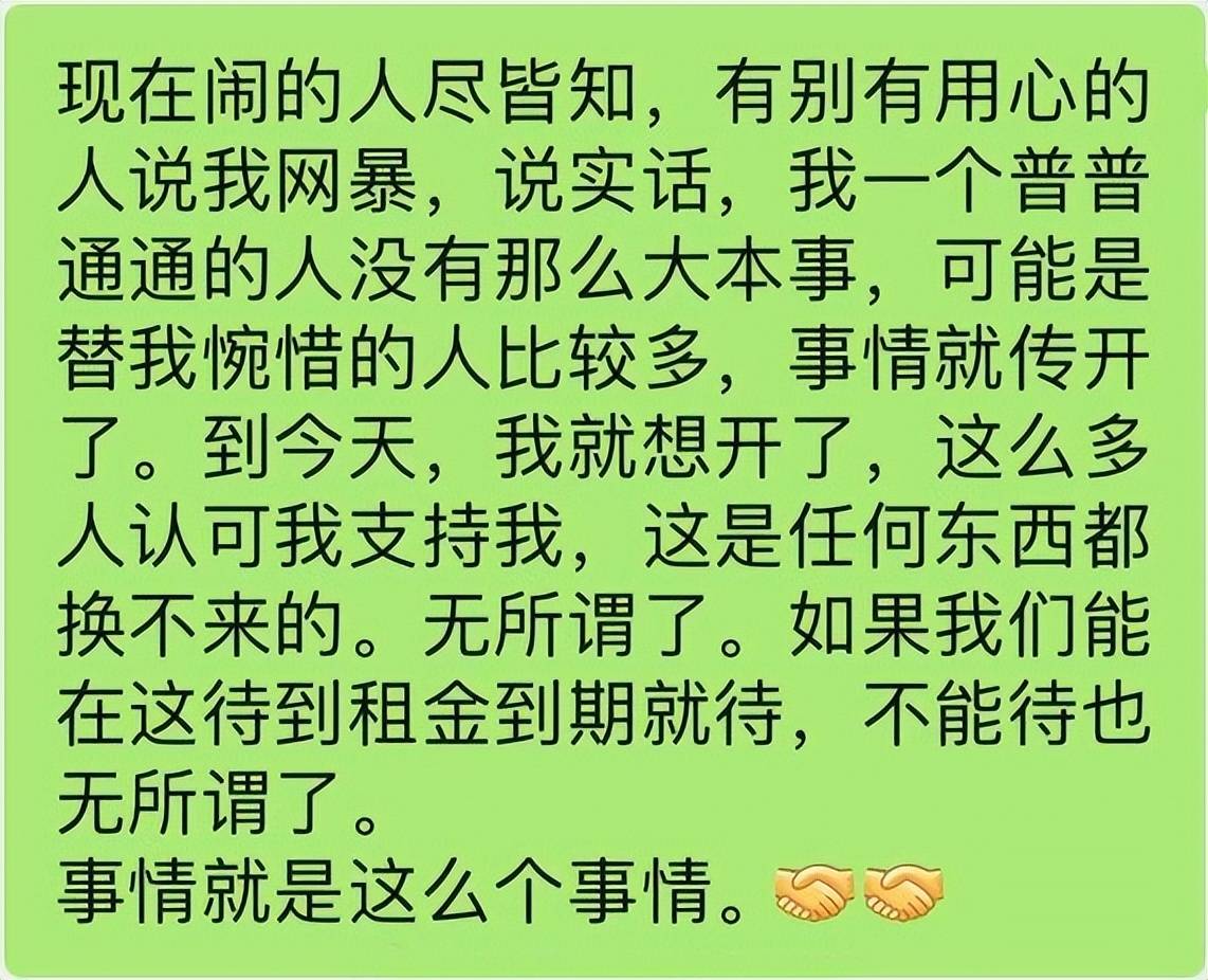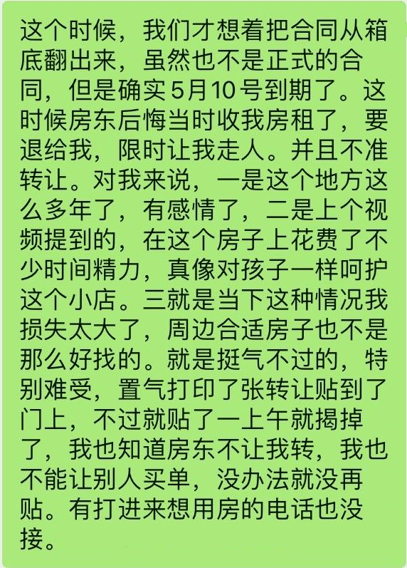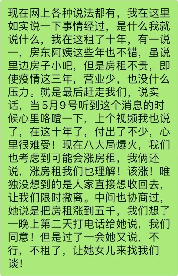 5月14日,杜老板又发了一条视频,以文字形式详细讲述了事情的整个经过。他说,“现在八大局爆火,我们也考虑到可能会涨房租,我俩还说,涨房租我们也理解!该涨!唯独没想到的是人家直接想收回去……这时候房东后悔当时(5月6日)收我(一个季度)房租了,要退给我,限时让我走人,并且不准转让。”