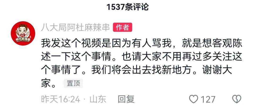 14日下午,在当天视频下方的评论区,阿杜麻辣串的老板明确表示,“将会出去找新地方。谢谢大家”。