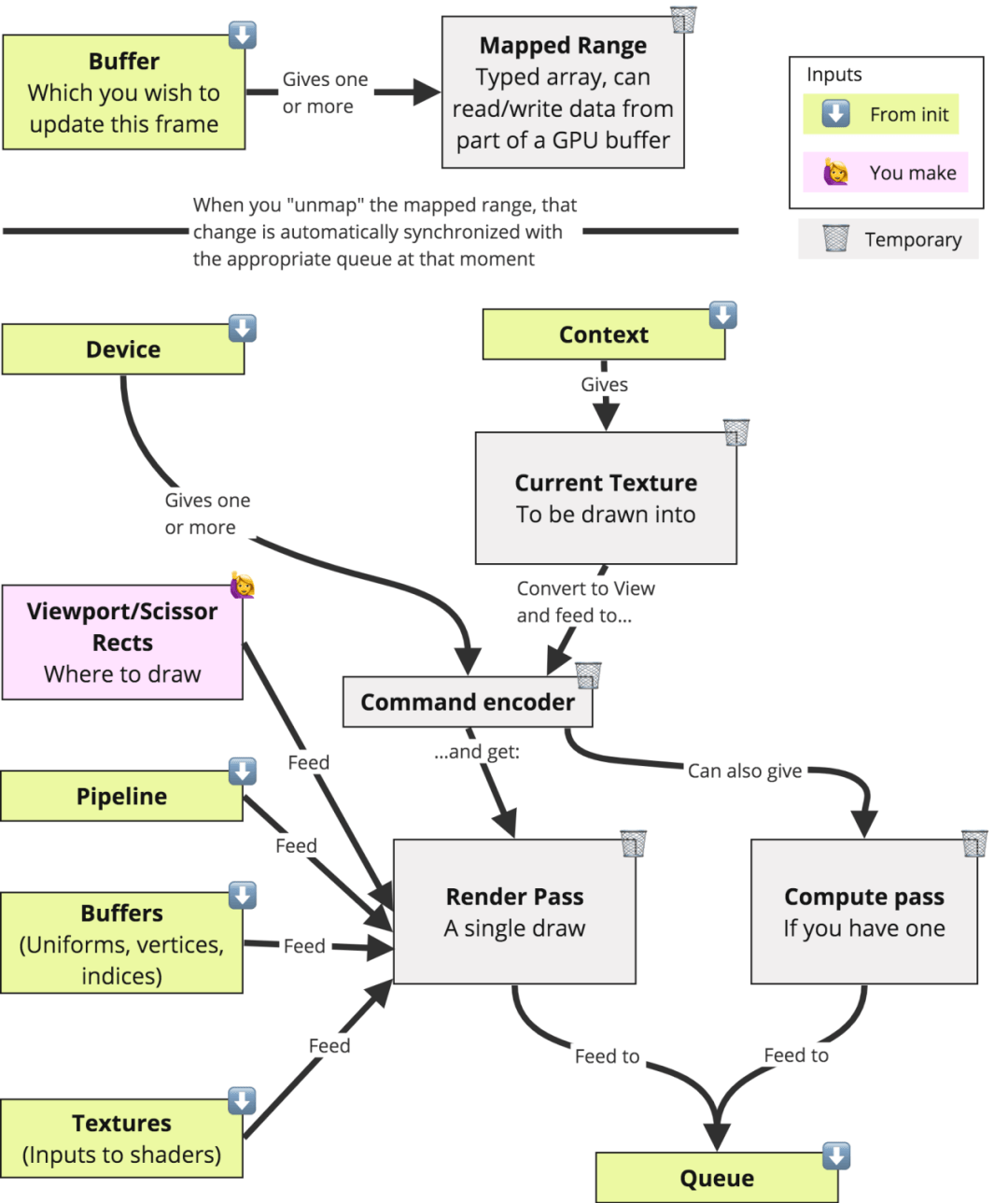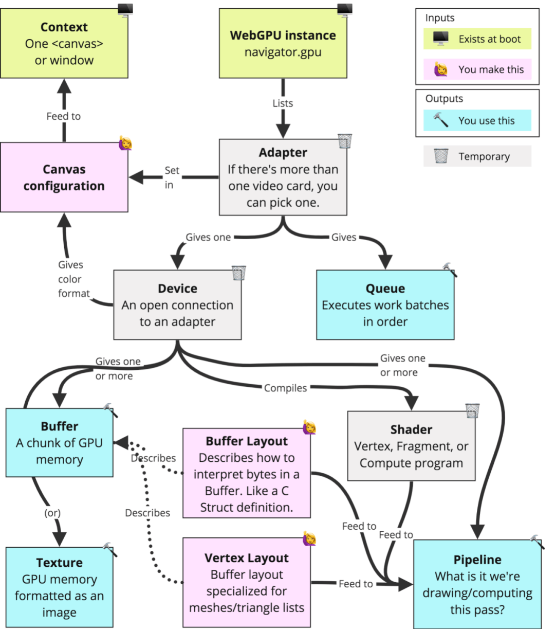 这里用图表形式展现了需要创建的所有内容,从最初设置WebGPU到渲染。看起来有点庞大,不过别担心,你只需从一些示例代码中复制并粘贴一大块代码罢了。