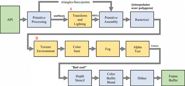 最早期的OpenGL是一个“固定函数渲染器”,3D渲染时固定的按顺序执行相应的功能函数。