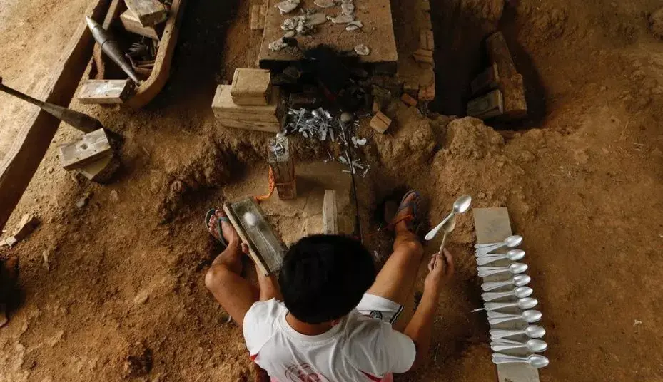 铝制弹壳通过土法融化,可用来做餐具。