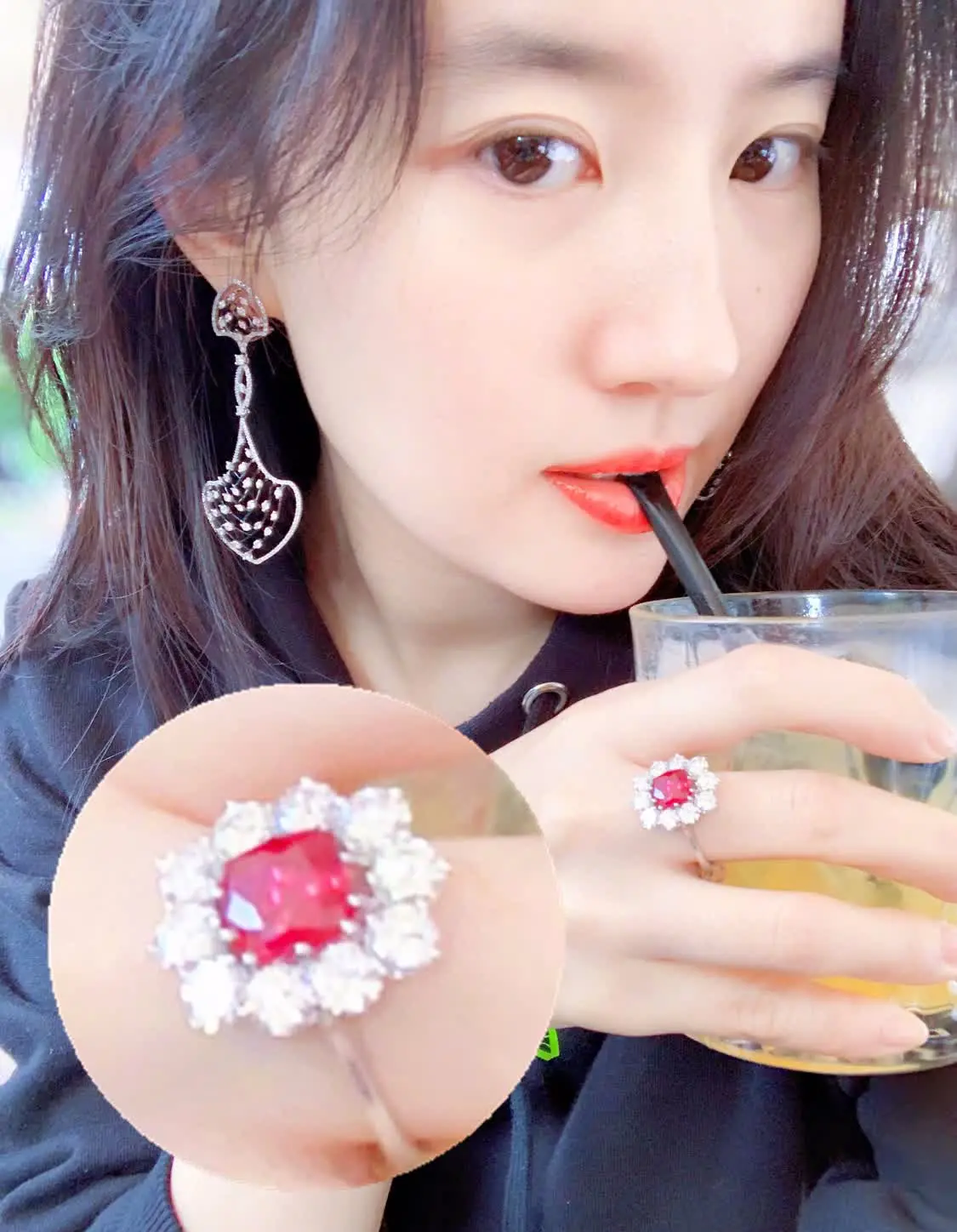 刘亦菲身穿简单休闲的卫衣,但是打扮的有些隆重,手上戴的戒指一看就价值不菲,耳饰也非常好看,还化上美美的妆容出行,看来今日心情非常不错,都忍不住自拍“臭美”一下了!