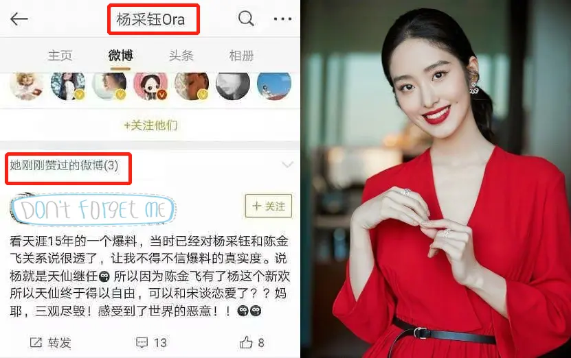 有网友还扒出了杨采钰给刘亦菲和陈金飞的八卦黑帖点赞,居然还是用大号,这一操作真是有些招黑啊!