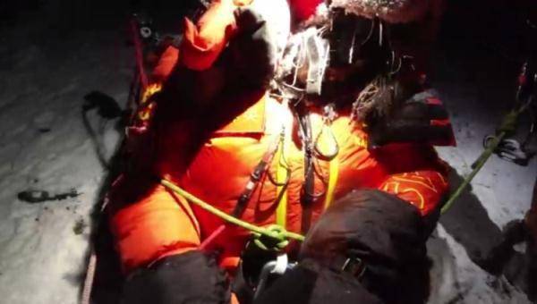 经过检查,范江涛发现,这名登山者的氧气已经用完,脸部覆盖了薄冰,手也冻伤了,生命体征微弱。背后的下降器被锁死,整个人被固定在主绳上无法移动。