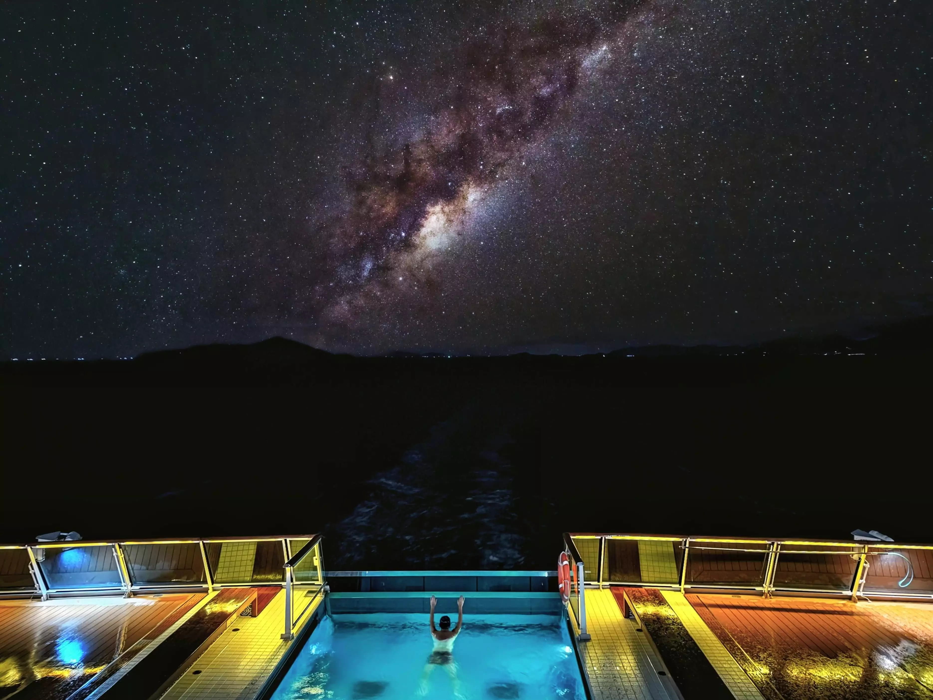 招商伊敦号的7层的无边泳池太吸睛啦!海水和泳池一样蓝,出网红大片的机会怎能错过?偷偷告诉大家,晚上一边仰泳一边看漫天星辰,真的很浪漫!晚上克莱因蓝的中央泳池同样很漂亮,在这里游几个来回消消食真不错!