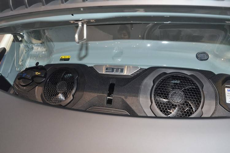 实拍的车并没有采用海外比赛用的碳纤维座椅,而采用的是带有18向电动调节的自适应运动座椅,舒适性要更好一些。后排并没有配备座椅,这是因为后桥提升系统的气罐在这个位置下面的空间里,虽然不能坐人,但可以当成储物空间,这样想想也不错。