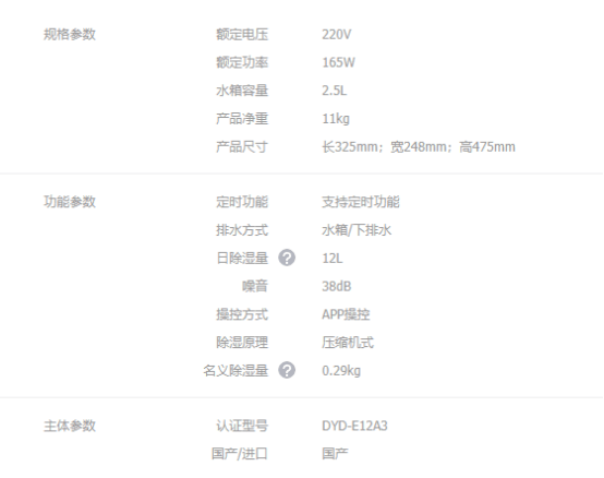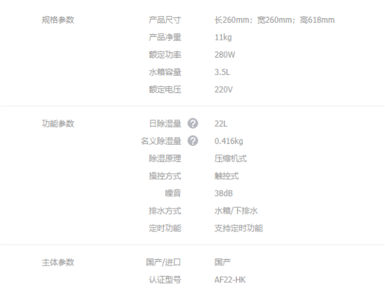 入门款,价格不贵,抽湿能力有限,好在噪音不大。体积不大,12L的日除湿量小客厅或者小房间是够用的。