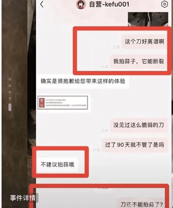 对此,张小泉客服人员称,斩骨刀仅适合家用,仅能砍小型骨头,且要直起直落。出现断裂可能与斩骨时的力度、角度及使用时间有关,一般正常使用不会出现问题,如情况属实可为顾客做退换处理。