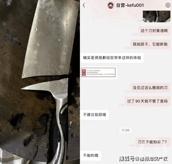 不仅如此,今年2月份江苏徐州一消费者也吐槽称,用张小泉菜刀拍蒜后,刀断成两截。对此,张小泉厂家客服人员则表示,菜刀能不能拍蒜看材质,硬度越大越脆越容易断,厂家也在努力改进这种情况。