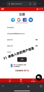 首先,打开老虎平台网站:https://tiger-sms.com/cn ,点击网站,自动跳转到老虎平台的首页。先转换到中文模式,更方便了解,点击【注册】,分别填入【登录】昵称、电子邮箱、密码和联系方式的信息,点击下方的【注册】,就成功获得了老虎平台的账号。