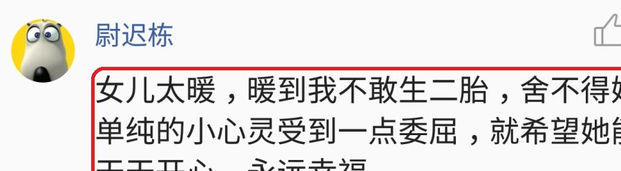 我女儿一周岁,放炮的声音把她吓一跳,然后我教过她,摸摸头,吓不着。那天就给自己摸摸头,然后不知道想起什么来了,就帮我也摸摸,谁能理解我那一瞬间的感动,一辈子的感动啊