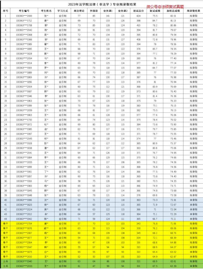 法律(非法学)拟录取46人,初试最高分424,最低分363;