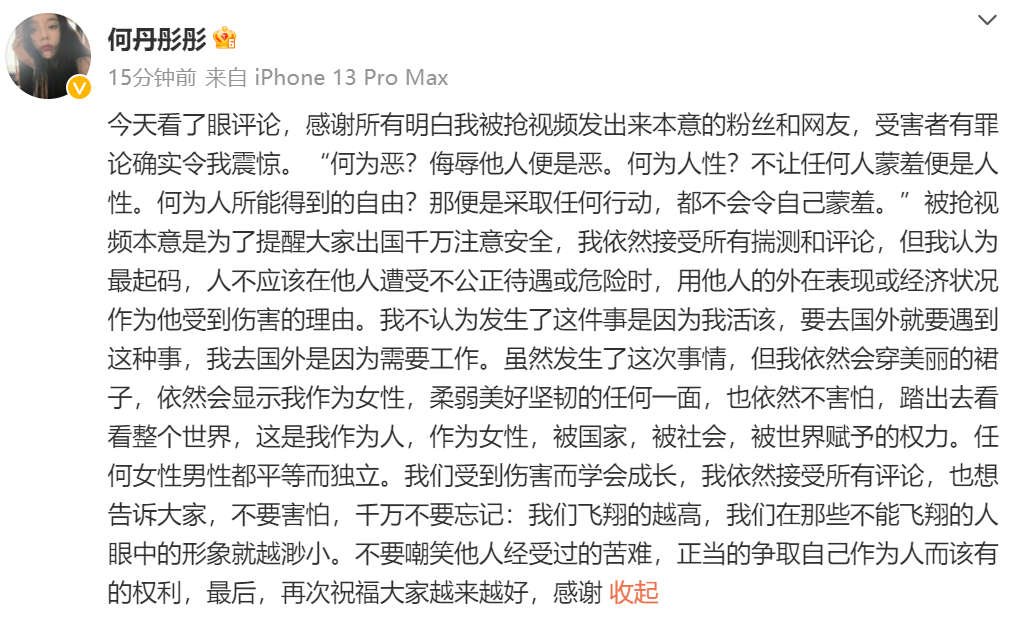 5月27日晚,何丹彤再次发声,回应网友质疑:“感谢所有明白我被抢视频发出来本意的粉丝和网友,受害者有罪论确实令我震惊。…… 被抢视频本意是为了提醒大家出国千万注意安全,我依然接受所有揣测和评论,但我认为最起码,人不应该在他人遭受不公正待遇或危险时,用他人的外在表现或经济状况作为他受到伤害的理由。 我不认为发生了这件事是因为我活该,要去国外就要遇到这种事,我去国外是因为需要工作。……最后,再次祝福大家越来越好。”