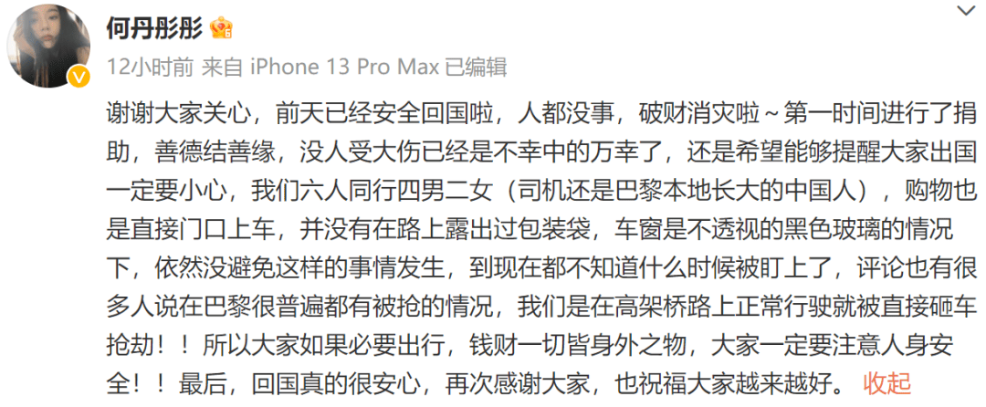 她再一次回顾了被抢劫的过程, 称他们是六人同行,四男二女,司机是巴黎本地长大的中国人,购物都是直接从门口上车,并没有在路上露出过包装袋,车窗是不透视的黑色玻璃,没想到却依然被劫匪盯上,而且是在高架桥路上正常行驶,就被直接尾随砸车窗。何丹彤还提及,评论区很多人都表示在巴黎有被抢的情况,她提醒大家,钱财一切皆身外之物,一定要注意人身安全!