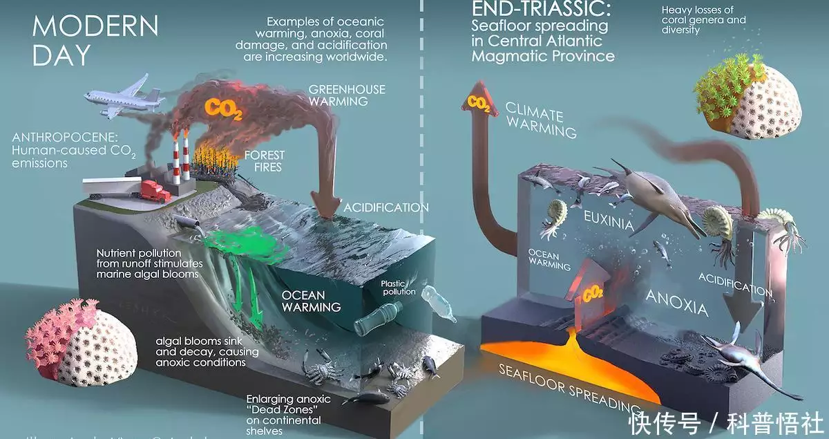 这些大规模火山运动喷发向地球大气中释放了大量的二氧化碳等温室气体。过多的二氧化碳不仅让海洋酸化,导致海洋生物大灭绝。随之而来的温室效应,也让盘古大陆经历了一场规模空前的大暴雨事件。全球气温升高了6到8度,海洋蒸发加速为整片大陆带来了超级降雨,整整持续了200多万年的时间,被称为卡尼期洪积事件。