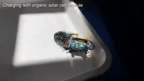 有了电子元件,肯定就需要供电系统。这个半机械蟑螂的主要电力来源于太阳能,在其尾部有附着一个4μm厚的有机太阳能电池组件。