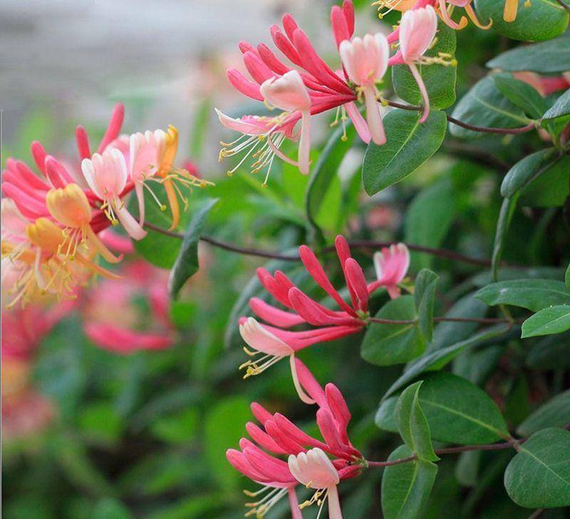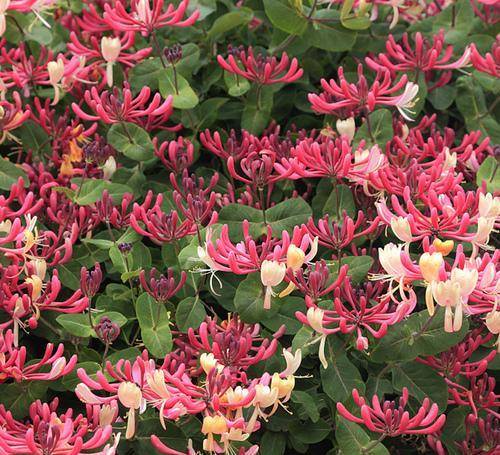 还有一种园艺品种的金银花京九红,它的花朵和金银花类似,但是比金银花更加漂亮,开花量也更大。从春天一直能开到秋天,很多的大学校园中也经常养着这种红色金银花,花期很长,花量巨大,开花又漂亮。而且耐寒性非常强,零下二三十度不用管它,丢在室外就可以自行过冬,长势强悍开花旺盛,耐贫瘠,耐干旱,耐炎热。随随便便就可以爬成一个个大花墙,非常适合在北方地区养护。