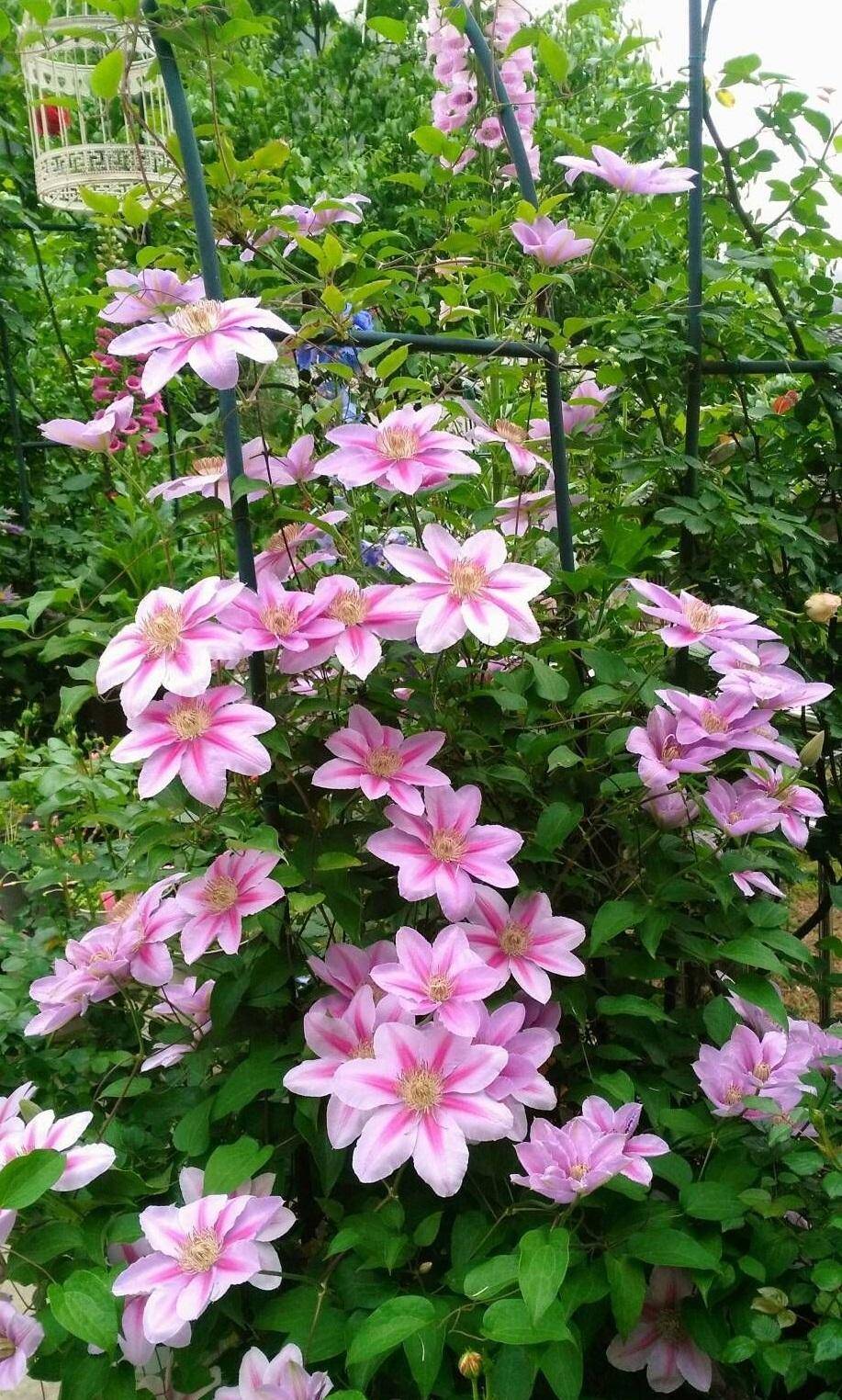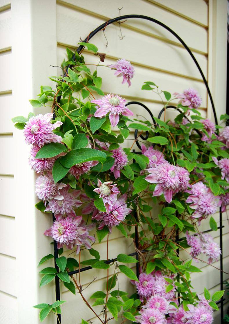 它的根系是非常发达的都是一些粗壮的根系。根越多花越多,一年的小苗儿就能够开花几十朵,零下二十几度也冻不死它,因为它的枝条儿就像铁丝一样,缺少水分。所以耐冻性、耐风沙性更强悍一些,年年能爬藤开成一片花,枝条所到之处全是花。在北方地区造花园,铁线莲是必不可缺少的花卉植物之一。