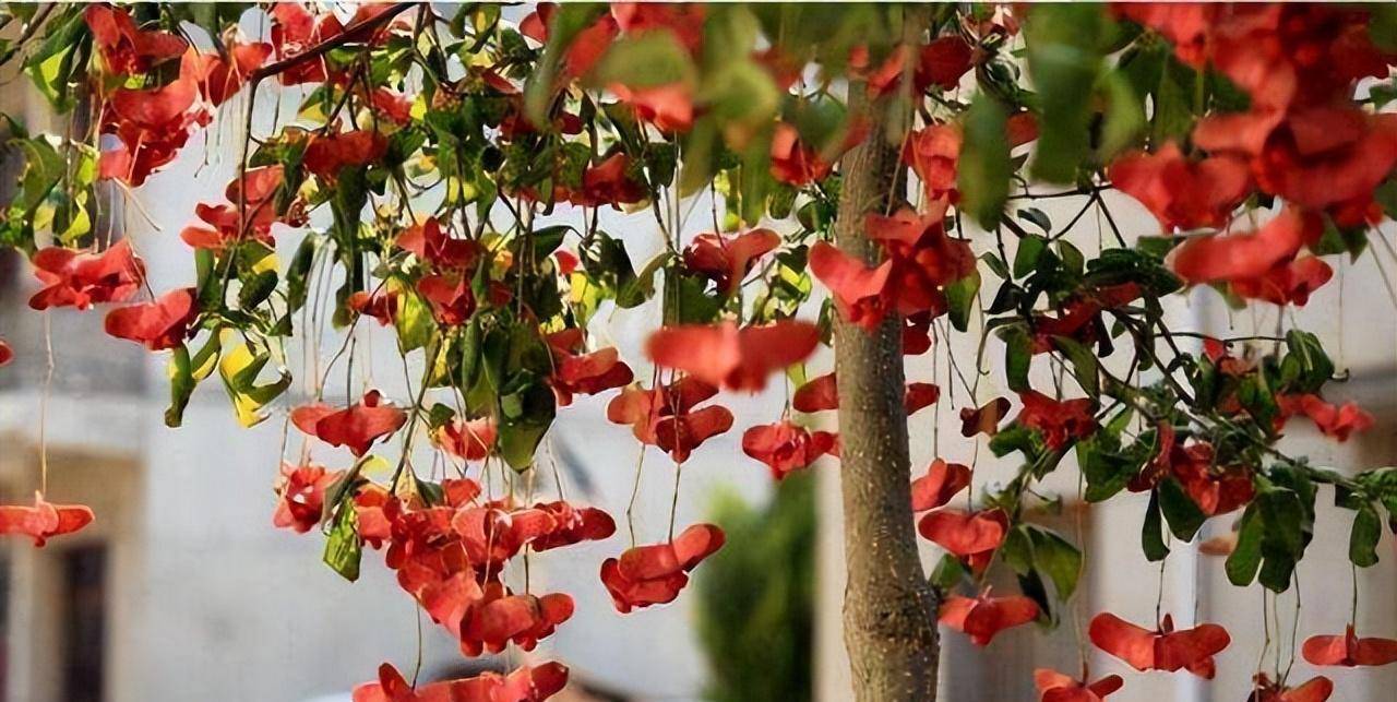 金丝吊蝴蝶也是一种比较稀罕的花卉植物,它能长成一个个花树。它虽然开花普普通通一般。但是它的果子特别的显眼,红彤彤的就像一个一个的蝴蝶一般垂下来,远远看去就像一个个小小的元宝,因此也叫做元宝花。它的茎干细长,把果子长长地垂下来琳琅满目,观果期很长。