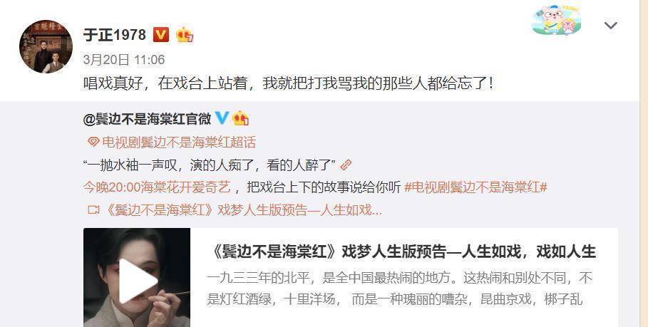 于是,这两年流行耽美文,于正就立马着手拍了一部《鬓边不是海棠红》。