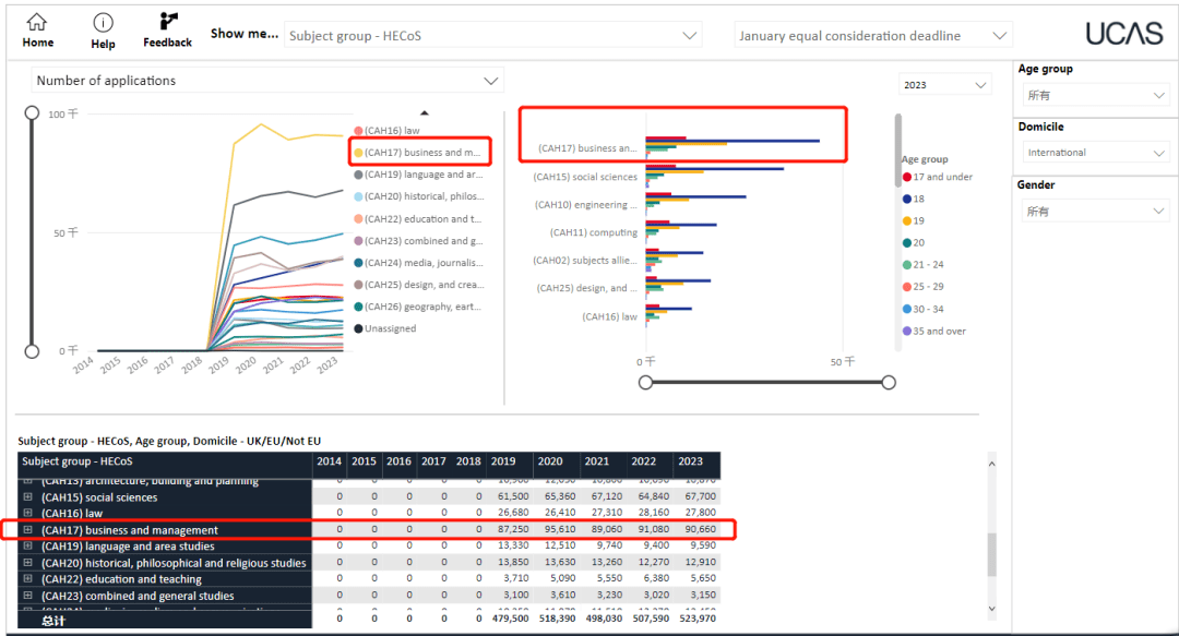 UCAS此前也公布了2022申请周期各专业人数变化情况, 商业管理类(经济类包括其中)申请者数量非常多,2023年突破9万申请人数大关,远超其他许多专业学科。