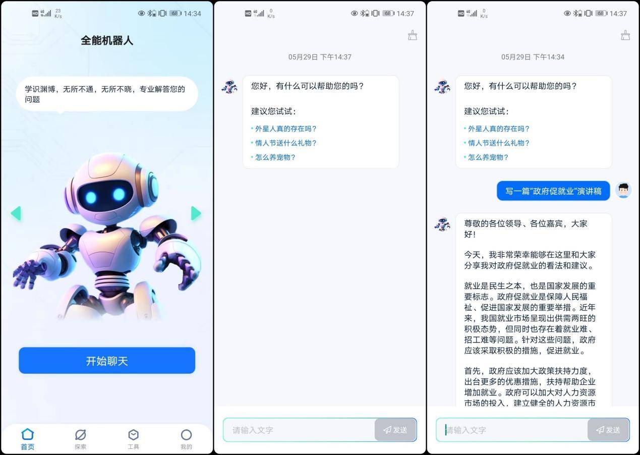这个工具也是在手机上操作使用的,拥有丰富多样的AI小助手,可以帮助我们完成各种文章写作。想要生成一篇发言演讲稿,只要在页面上选择“全能机器人”,在聊天对话框中输入演讲稿的主题,就会为我们生成一篇演讲稿啦,生成出来的内容可以一键复制,方便使用。