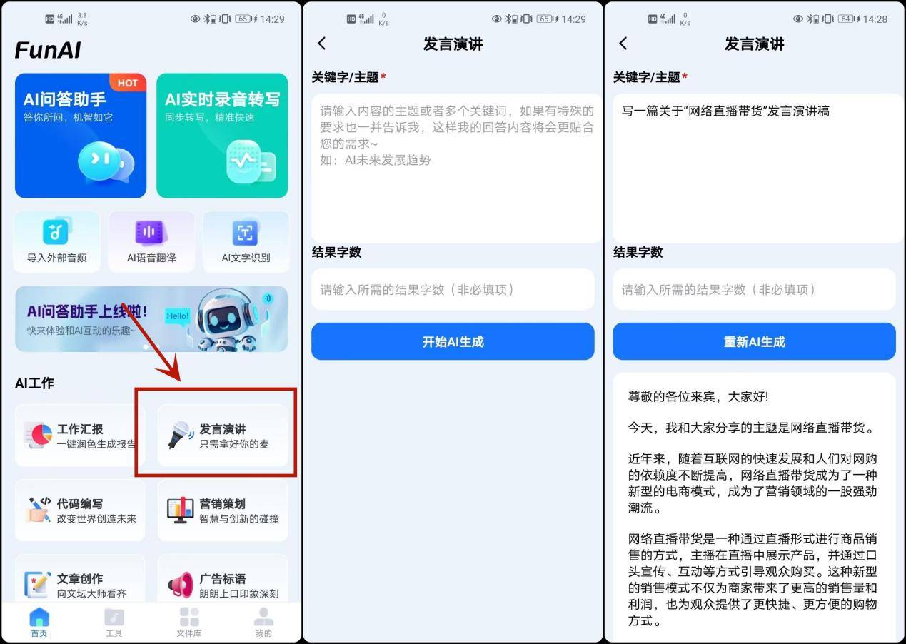 这是一个手机上使用的AI工具,能够通过AI帮助我们生成很多内容,如我们可以使用它来写文章,写总结,写编码,还有可以写我们需要的发言演讲稿,操作起来也很简单,我们只要在软件的页面上点击“发言演讲”,进入之后我们可以将演讲稿的关键词、主题给输入进去,还可以设置结果字数,输入好后点击开始生成就可以了,整个过程两分钟就可以解决,是不是非常方便呢。