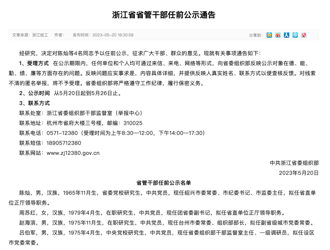 此前,浙江省委组织部曾于5月20日发布干部任前公示,时任团省委副书记周苏红,拟任省直单位正厅领导职务。公示时间从5月20日起到5月26日止。