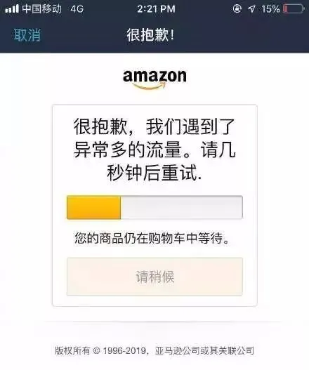 折扣消息一出,大量用户在短时间内涌进亚马逊平台进行抢购,这给网站服务器造成了巨大压力,导致亚马逊中国在内的PC端、移动客户端、微信小程序均已无法打开。