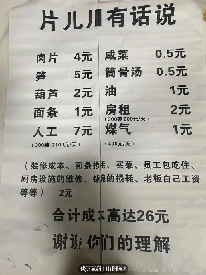 事情的缘起是网友拍下了店里贴着的单子《片儿川有话说》,上面罗列了关于一碗28元片儿川的各项成本支出,其中包含肉片4元、笋5元、人工7元、房租两元等等。