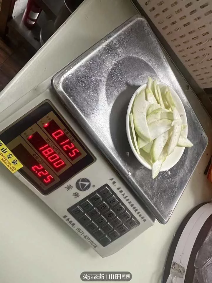 陈老板依次将笋、猪肉、葫芦在称重计上过称。