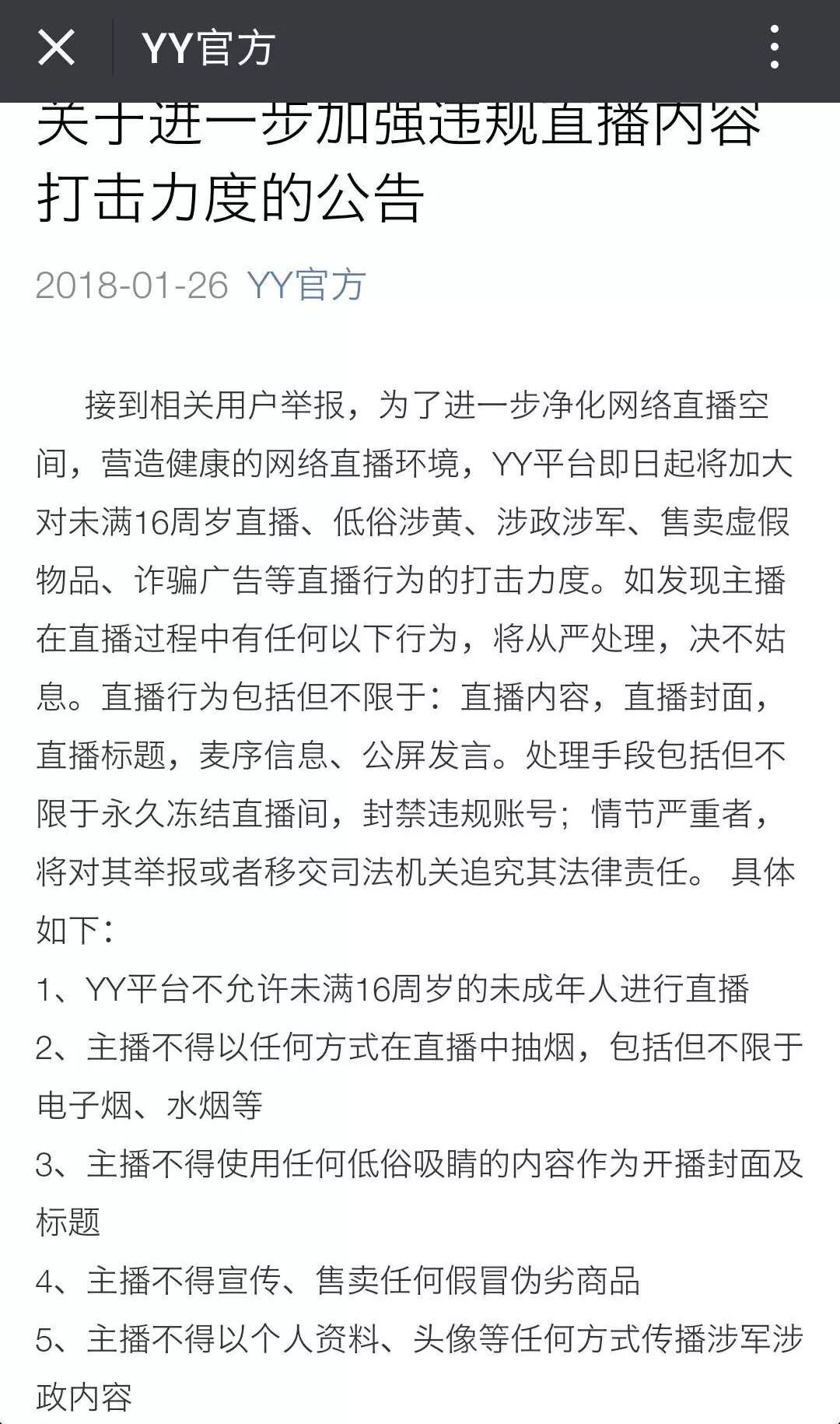 YY官方最近还发布了《关于进一步加强违规直播内容打击力度的公告》,加大对未满16周岁直播、低俗涉黄、涉政涉军、售卖虚假物品、欺诈广告等直播行为的打击力度。