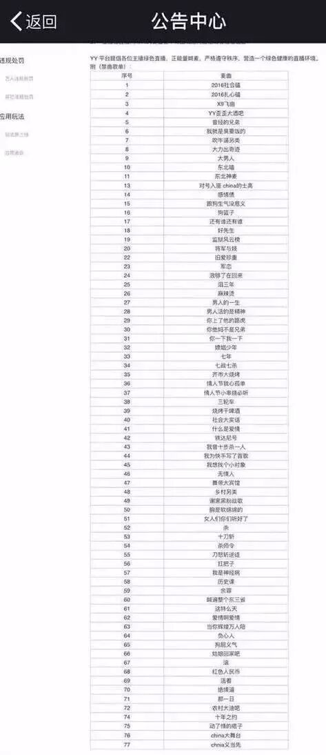 继嘻哈歌曲被下架后,喊麦歌曲也迎来“下架潮”?近日,网传YY直播平台发布公告,要求主播昵称都不允许带MC、喊麦、交友、两性等字眼,并将77首“喊麦”曲目列为“禁曲”。甚至还放出了“被禁”歌曲的相关歌单。