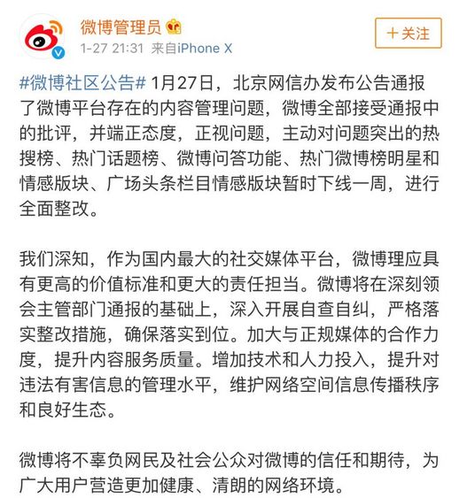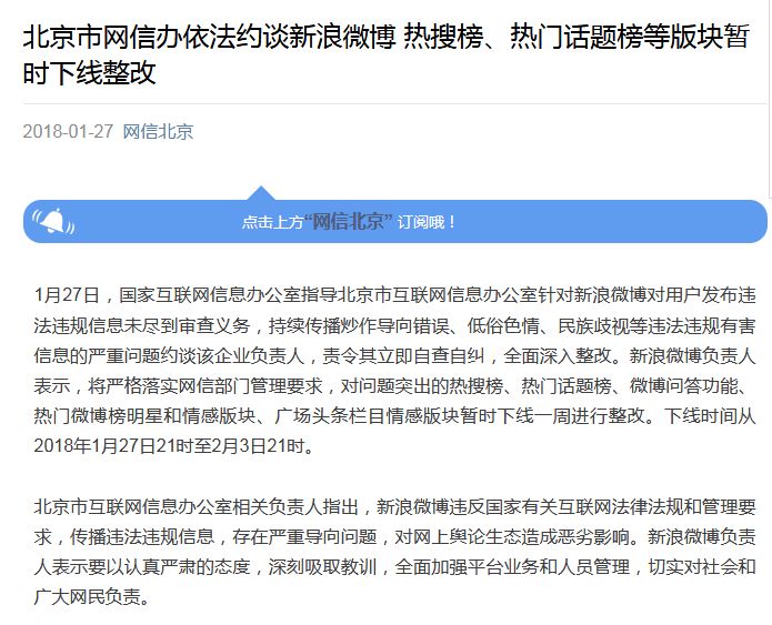 1月27日晚上开始,新浪微博的热搜榜、热门话题榜、热门微博榜明星和情感板块等栏目突然消失。随后,北京网信办在其微信订阅号发布消息,将其下线原因归为“新浪微博违反国家有关互联网法律法规和管理要求,传播违法违规信息,存在严重导向问题,对网上舆论生态造成恶劣影响。”坐实了此消息。