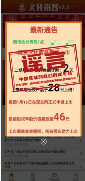 真相:近日,一款名为“文化南昌”的APP以南昌市人民政府、市政投资等名义开展网络集资诈骗行为,含大量伪造的官方文件,并以高利息、事业编制等诱导使用者进行投资。