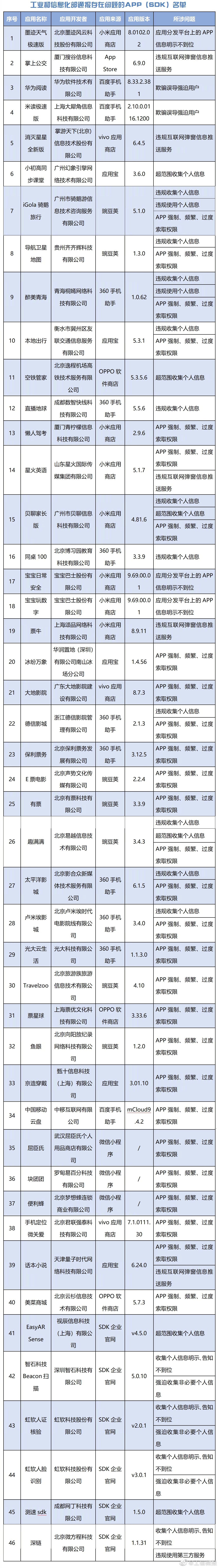 通报:工信部通报46款存在侵害用户权益行为APP及SDK