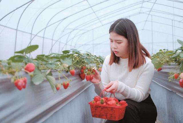 立春之后,天气晴好。不少游客前来果园镇邦博农业采摘草莓。章帝 摄星沙时报讯(记者 梁焕鑫 通讯员 袁思缘)春日暖阳,正是大棚草莓成熟上市的季节,长沙县果园镇杨泗庙社区的邦博农业草莓园里,鲜红欲滴的草莓陆续成熟,进入采摘期,售价80元/公斤,引来不少游客前来采摘。