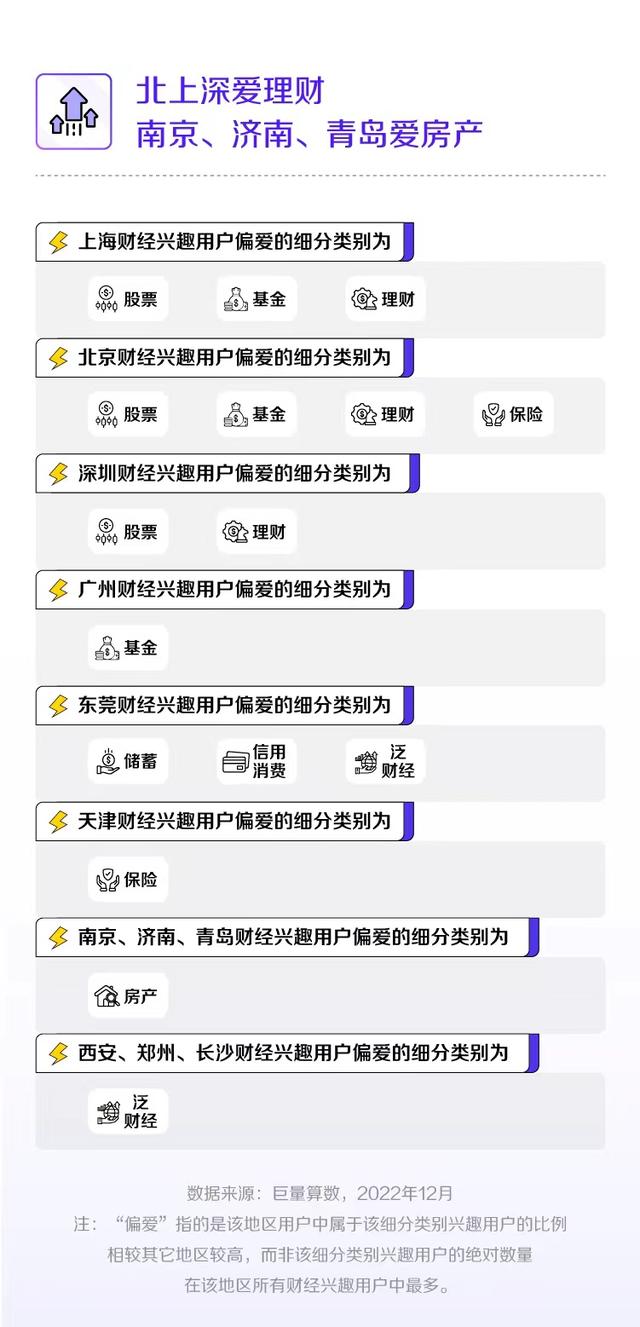 报告呈现了不同城市财经兴趣用户对不同细分类别内容的偏爱,北京、上海用户偏爱股票、基金、理财类知识科普内容,广州用户更专注基金类知识,深圳用户喜欢股票和理财类科普,天津用户更偏爱保险类知识,南京、济南、青岛用户对房产内容情有独钟,西安、郑州、长沙用户则更爱看泛财经类。