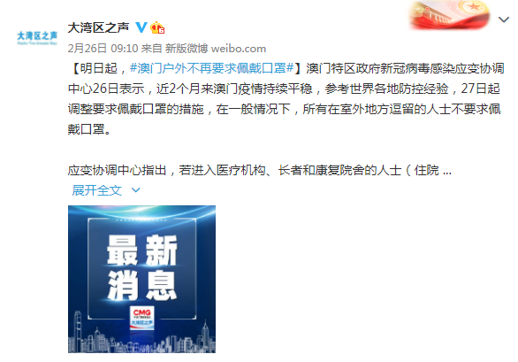 简介据@大湾区之声 澳门特区政府新冠病毒感染 应变协调中心26日表示 近2个月来澳门疫情持续平稳 参考世界各...
