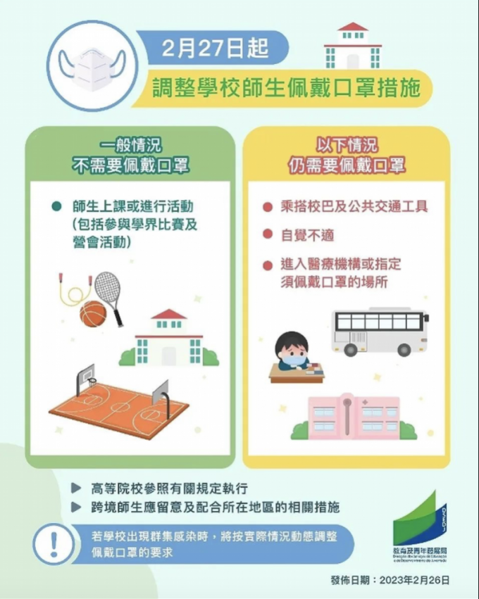 不过,教青局指出,在乘搭校巴及公共交通工具;自觉不适,个人出现发热、肌痛、咽痛、咳嗽或流涕等流感样症状时;进入医疗机构或指定须佩戴口罩的场所时,师生仍需要佩戴口罩。