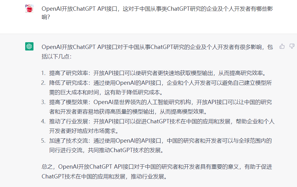 我们先问了ChatGPT,在开放API后,会对国内的企业和开发者产生什么样的影响,ChatGPT给了一个中规中矩的回答。