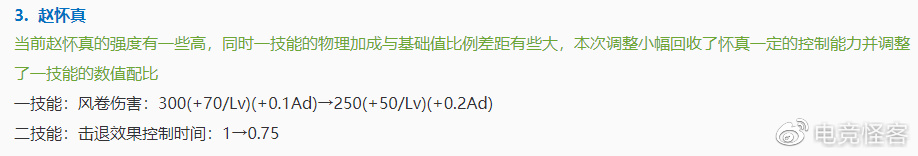 赵怀真一技能伤害小幅下调,二技能击退的控制时间也减少了0.25s,总的来说算是一次中小幅的削弱吧。