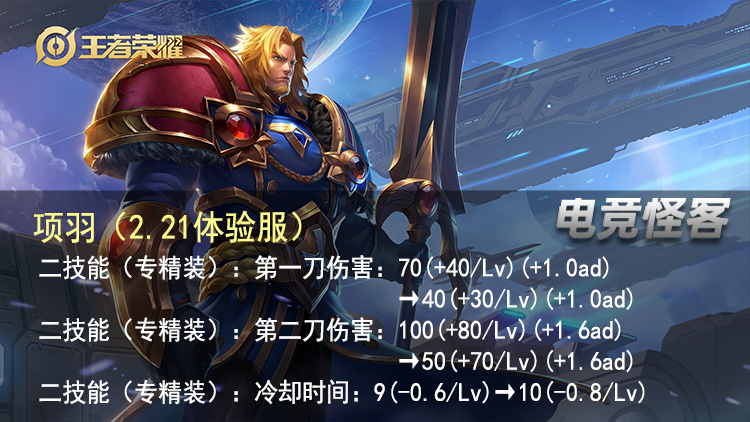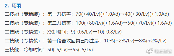 当时是二技能的第一刀和第二刀的基础伤害几乎迎来了一个对半砍。不过测试了一段时间之后,估计是策划觉得依然削得不够,就在3月1日在体验服再次对项羽专精装进行了削弱。