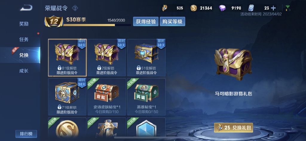 大家在游戏内战令-兑换里即可查看S26和S20赛季的战令限定皮肤礼包,需要本赛季进阶战令后方可使用战令币进行兑换。