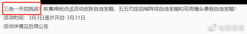 3月3号,也就是今天下午,正式服内会逐步开放这个春日挑战送皮肤的活动。目前活动详情还没出,但根据昨天的官方公告,赠送的皮肤应该一共是有3款的。除了海报上的蒙恬-蔚蓝守将、刘禅-唤灵魔甲以外,应该还有一款皮肤,一共是三选一。
